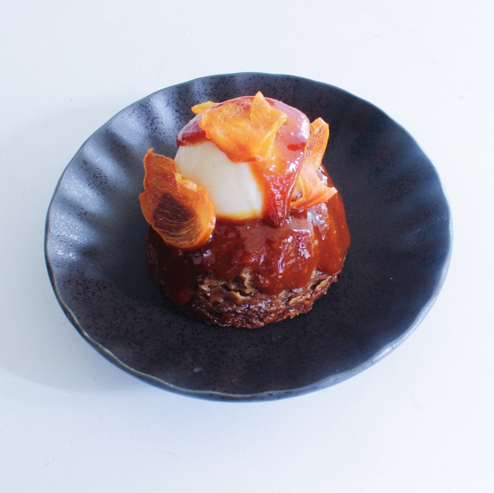 These sticky toffee puddings are the love child of two Chinese ingredients(Chinese almond powder and persimmons) and a classic British dessert. Whenever the fall/winter rolls around, persimmons are abundant. And trust me when I say this, but having Chinese/Taiwanese family friends, I find myself rolling in persimmons every fall because I always know someone that grows them fresh. While I love the taste of a ripe hachiya persimmon, I personally grew up on fuyu persimmons. The difference between the two is that hachiya are rounder in shape and cannot be eaten raw, while fuyu are flatter persimmon that can be eaten raw; an unripe fuyu persimmon tastes like a dryer apple or cantaloupe. With the unripe fuyu, I love shaving those and making these thin candied chip slices with them. And with the ripe, I like to peel those, and puree the pulp to be made into all kinds of fun components and desserts. In this case, I used the pulp in both the sticky toffee sponge and the toffee itself! And to contrast this kind of rich, sticky dessert, I made a Chinese almond tofu ice cream, made by combining almond powder(which tastes like almond extract but more floral and warming) with soy bean milk, and turning that into an ice cream. Oh, and fun fact, this dessert is 100% vegan AND gluten-free!