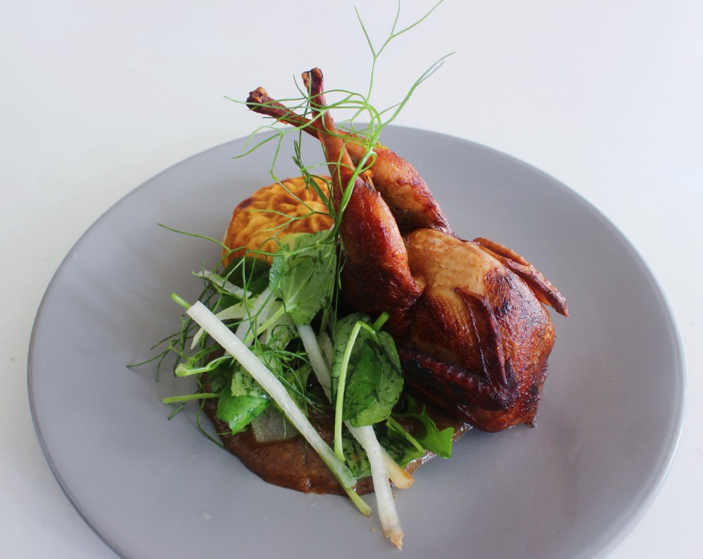 To plate the dish, start with the sauce in a large circle, and then place down the mooncake, the quail, and the salad to finish.
