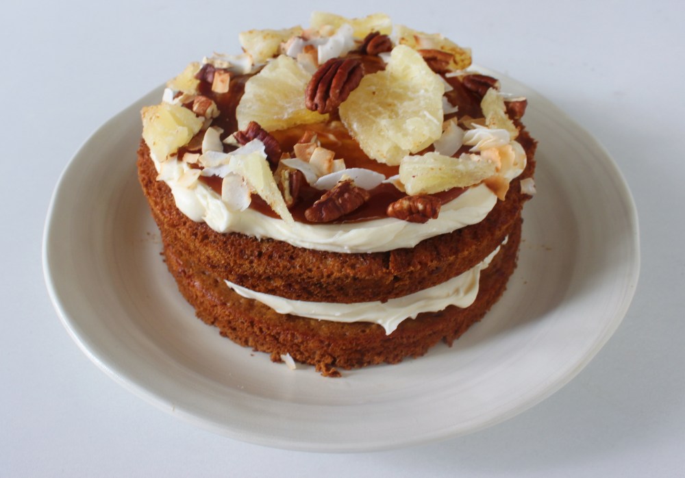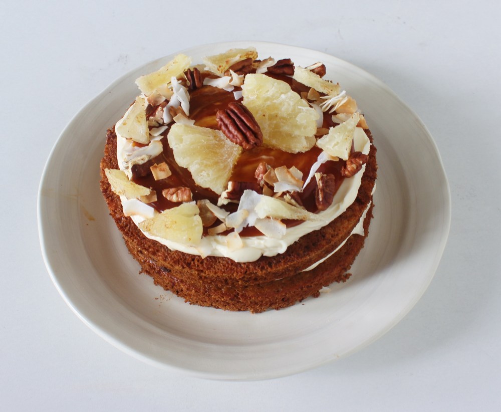 Divide the frosting into 4 equal portions. Frost each cake round with the frosting. Then divide the caramel into 4 equal portions and drizzle on top of each cake round. Sprinkle half of your toasted pecans, coconut flakes, and pineapple pieces onto two of the cake rounds. Then place the un-adorned rounds on top of those. Then arrange the pineapple slices and pecans to resemble butterflies and place those into the center of each cake. Adorn the edges of the top layer with the remaining garnishes to finish.