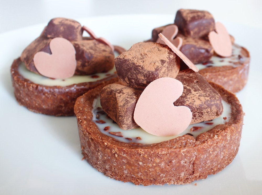 Start by garnishing the tops of your tartlets with 4 cubes of the nama chocolate, then 3 of the ruby chocolate hearts. Keep the tarts refrigerated if not serving right away.