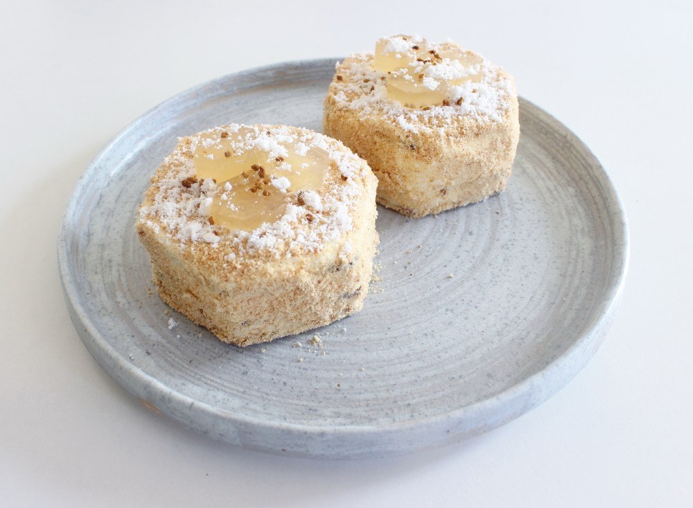 Garnish the tops of the cakes with the brown butter snow, the gelee, and bee pollen to finish.