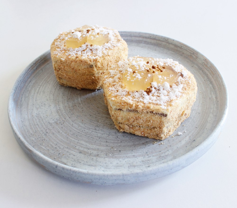 For the components, we have a honey cake dough, a creme fraiche-cream cheese filling, brown butter snow, and honey gelee. From a technical standpoint, the two components that do require some precision are the cake dough and the gelee. The cake dough requires a lot of patience. You have to make a sugar syrup, you have to brown some butter, and whisk that all together with eggs and flour to form a cookie-like dough. That dough then needs to be rolled thinly, sliced, then baked. And you need 4 layers of the dough for each individual cake. It is a labor-intensive process, but it is so fun to peel apart the layers of each cake once it is assembled and just kind of eating each one like an individual frosted cookie. The filling, so long as you do not overwhip it, it comes together really quickly. Just keep an eye on it and the moment there are no lumps, you are good to go there. The snow is made with tapioca maltodextrin, which is a fun technique, but not one that requires a lot of monitoring. The gelee, on the other hand, it is about getting the right consistency on the gelee base. If you reduce the liquid too much or too little, it will not set properly. I find that bringing it to a boil works best, but you may need two or three attempts at this to get it right(fortunately, if you under or over reduce it, you can either put it back on heat(under-reduced) or add more water to it and re-boil the mixture). All in all, my favorite parts of this recipe are assembling it, and eating it, layer by layer.