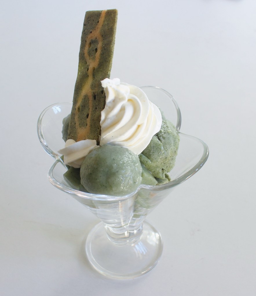 Start first with some of the kinako and mugwort crumbled tuiles. Then place down a 1oz scoop of the ice cream, 2 tbsp of the gelee, 2 dango, then repeat. Finish with the cream and a tuile on top.