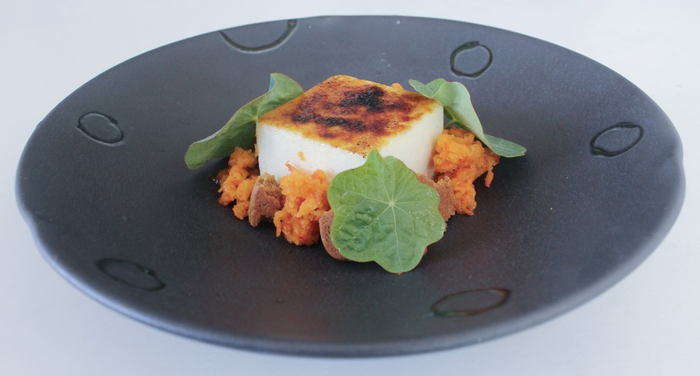 For the parts in this recipe, we have the cheesecake brulee cubes, the sata andagi crumble, the persimmon granita, and the fresh nasturtiums. In terms of time, the cheesecake and the granita probably take the longest amount of time. The granita, you need a ripe hachiya persimmon, and that needs to be frozen solid, so plan for that to be done in advanced before even starting any other component in this recipe. Fortunately, actually making the granita takes 2 seconds and a cheese grater, so it’s really just about getting the persimmon ripe and frozen enough first. The cheesecake needs time to bake and set, but the bigger commitment, similar to the persimmon, is getting it frozen solid so that you can safely remove it from the silicone cube molds. Right before serving, sugar is sprinkled on top and bruleed(make sure you own a blowtorch for this) in a caramelized layer on top. This is important since the bittersweet brulee layer helps to contrast the plainly sweet flavor in the crumble and the granita. The crumble itself came be made while everything else is sitting in the freezer, and comes together fairly easily. You do need to make brown butter and you need to rest the dough for 10 minutes in the fridge prior to baking it, but outside of that, it’s just mixing ingredients together then baking them, and then giving the crumble enough time to cool down so that it’s not super hot/melts the granita. For the nasturtiums, you might be able to get them from a specialty herb store, but mine grew in my garden. Prior to that, I was able to forage nasturtiums(and their gorgeous flowers) relatively easily, but that’s here in Southern California, so their availability in the wild may vary depending on where you live. Worst case, you can try using watercress, which does have a similar pepperiness, instead!