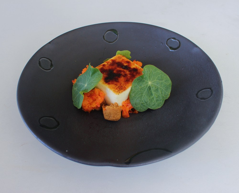 To plate, start by crumbling the sata andagi into smaller pieces, the size of your pinkie nails. Then sprinkle sugar on top of each cheesecake cube and using a blowtorch, carefully caramelize the sugar on top. Place one of cubes onto the center of a plate. Around it, place down the pieces of sata andagi crumble, then around that, the granita, and finally, the nasturtium leaves to finish.