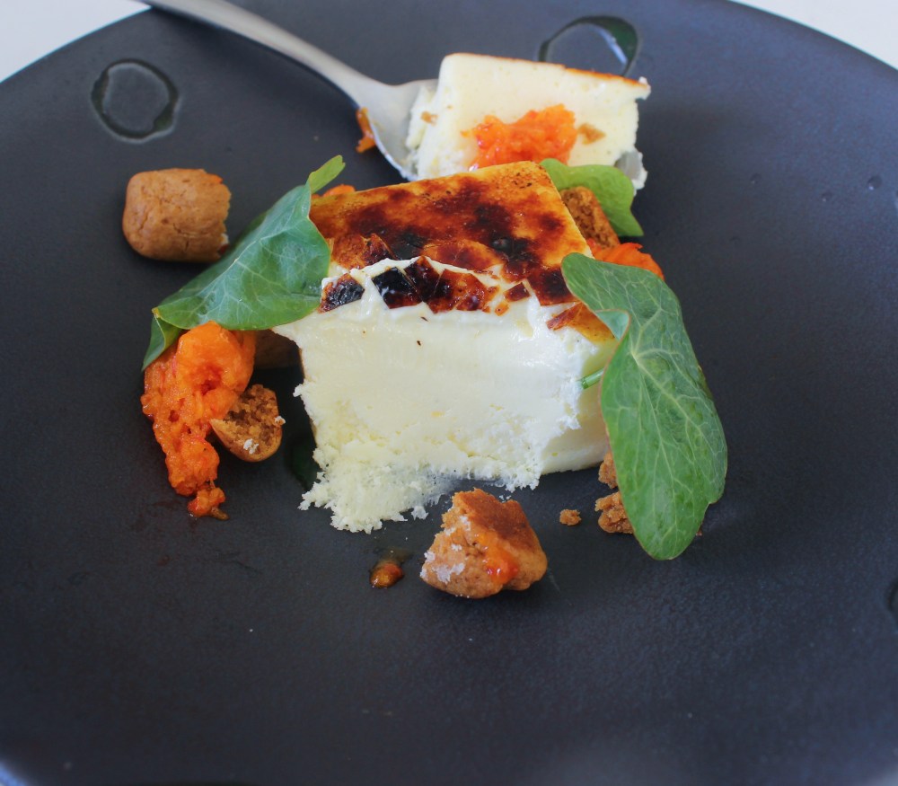 I came up with this by happy coincidence. I love when a lot of different factors or scenarios line up and I end up making a really cool dish. In this case, I was recipe testing a baked cheesecake filling, and happened to have more cheesecake filling compared to the crust I prepped. Rather than just dumping that down my sink, I figured, why not try baking this separately in silicone cube molds, and seeing what the end result is? And I was super happy to report that the cheesecake cubes were actually a success! I was already intending on doing this bruleed purin cube dessert, so I figured, let’s switch out the purin with these cheesecake cubes instead, since texturally, they will be very similar, with both being baked custard-types of things. Then came what to pair it with. My original idea was a bruleed purin cube with a kinako(toasted soy bean) crumble and macerated berries. But as I thought it through more, I wanted to replace the kinako crumble with something else: sata andag, or Japanese brown sugar doughnuts. I’ve made air-fried sourdough sata andagi in the past, but in this case, I wanted to take that rich, dense brown sugar dough and bake it in small pieces to form my crumble. The crumb that resulted was tender and soft, but with crispy edges. I swear one of these days I will make true and traditional sata andagi(so deep-fried), but for now, that style of dough continues to be made into so many unique and fun desserts that I can’t be made at that. For my other components, I had a hachiya persimmon granita and nasturtiums. The granita came about because I was gifted a super ripe hachiya persimmon(which is delicious and tender when ripe), but since I did not know what to do with it, I stuck it in the freezer, where it was sitting for at least a month. I was debating back and forth between using the persimmon or tangerines, since those were the fruits I had on hand, but I went with persimmon since that paired better with brown sugar and cream cheese. The nasturtiums were actually grown from my garden that I completely neglected/forgot about, but was pleasantly surprised to see still bore so many herbs and edible flowers that I am excited to use in recipes moving forward! They add a nice pepperiness to counteract the inherently sweet components(which all three components are), making this a relatively balanced dessert!
