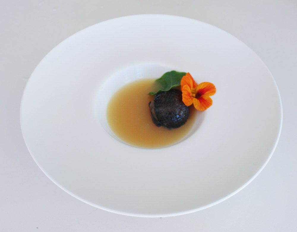This recipe wound up being like an Asian take on an albondigas soup, using black chicken(also called silkie fowl) as the base. Black chicken is a popular ingredient in Asian cuisines because it creates a gorgeous broth. My mother actually loves eating black chicken, which is why I opted to use it to make one of the courses for Mother’s Day(yes I know that Mother’s Day was in May, but I had a giant backlog of recipes, so what I made for that is only getting posted now). In this case, I went with a black chicken broth with tons of ginger, since my mom loves ginger as well. The flesh and skin of the black chicken might not look the most appealing, being either a grey or black color, but it literally tastes just like chicken, but with a Tim Burton/Hot Topic makeover. Just to not waste the chicken meat, I figured, why not turn that into a tsukune(Japanese meat ball) situation? Tsukune is slightly different than a regular meatball in that it is bound with egg white and starch instead of whole eggs and/or panade(soaked breadcrumbs). In the case of my tsukune, I used kewpie mayonnaise in lieu of an egg white because I needed to incorporate more fat into the mince mixture, as black chicken meat is extremely lean. I figured I could use the thigh and breast meat for the meatball mince, and then wrap it in the chicken skin, just as a way to ensure that the meatballs don’t dry out as they cook. The end result was actually a decently juicy meatball! The overall dish was really cute to look at, especially since I garnished this jet black meat ball with a golden chicken broth and some nasturtium leaves and flowers for that peppery finish.