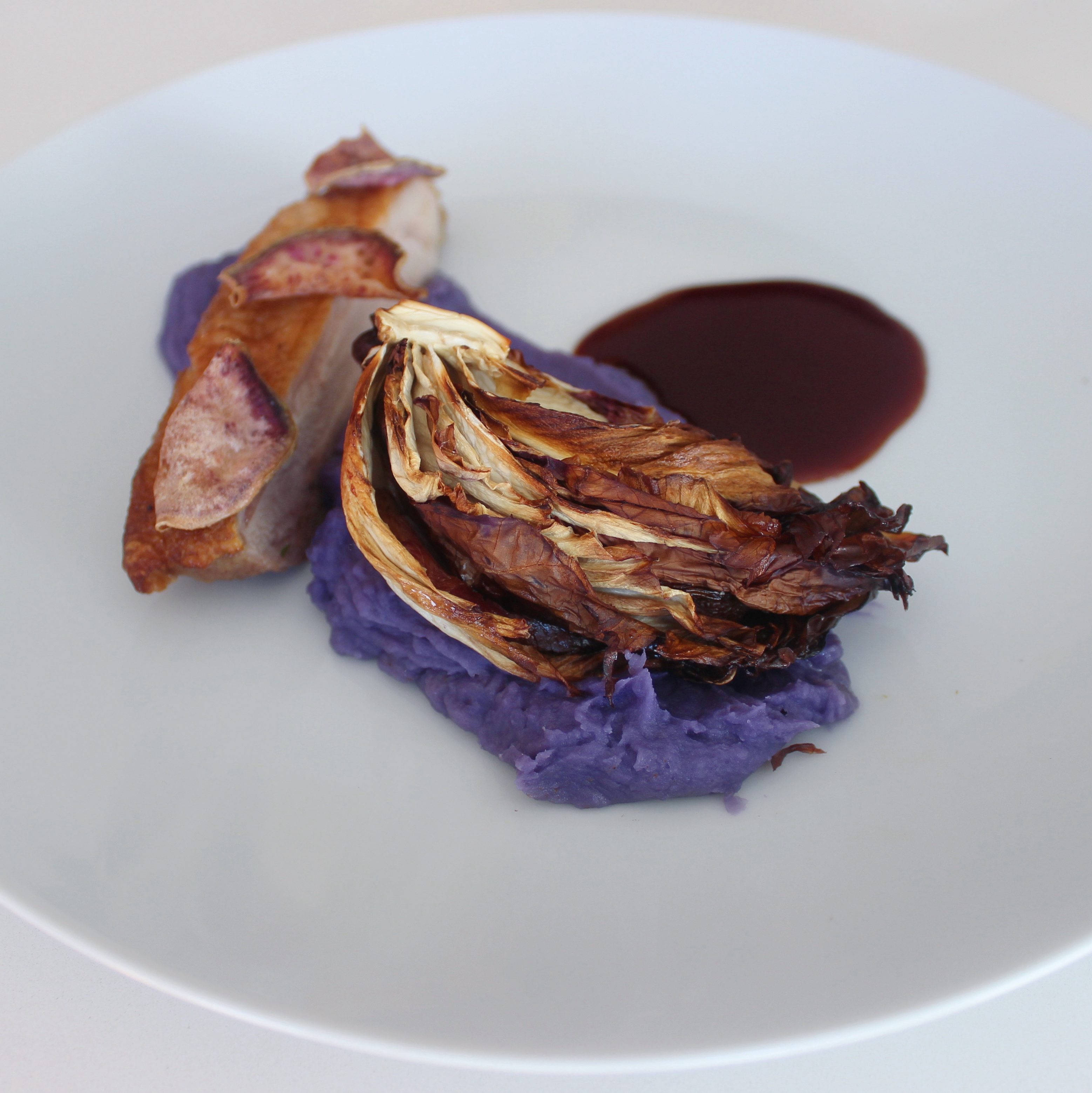 In terms of the technical aspects of this recipe, the radicchio is actually one of the bigger time commitments – we are layering up the radicchio leaves with thinly sliced pieces of smoked duck breast and honey, then roasting to so that you have this crispy-edged, melt-in-the-mouth bitter-sweet-salty-smoky cabbage situation. Needless to say, even if you hate radicchio(or just dislike bitter foods), this dish might actually convert you on that, since the other ingredients work well to contrast that bitterness. The purple yam puree and the sauce actually don’t take as much time to make, while the duck itself is just a low and slow-ish cooking process to ensure that the fat properly renders and that the skin gets crispy. The chips, admittedly do take a decent chunk of time, since they are dehydrated in the oven, but they do provide a colorful, crispy garnish for additional texture. I will admit that I accidentally overcooked my duck breast(I put my oven at too high of a temperature when I was finishing it in the oven), but I did adjust the times and temperatures for this recipe so that if you make this recipe, your duck will be a pleasant pink color instead of white like mine was.
