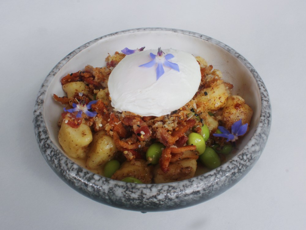 In a pan, start by rendering out the bacon until crispy. Reserve the bacon and 2oz of the fat for the breadcrumbs. With the remaining bacon fat, start by browning the butter in that, and to that, add in the garlic, stirring until nutty, and keep the butter sauce on low heat. In another pot, blanch the edamame for 30 seconds, then shock them in cold water. Add to the sauce your boiled gnocchi first, then the edamame, tossing everything together right before serving.