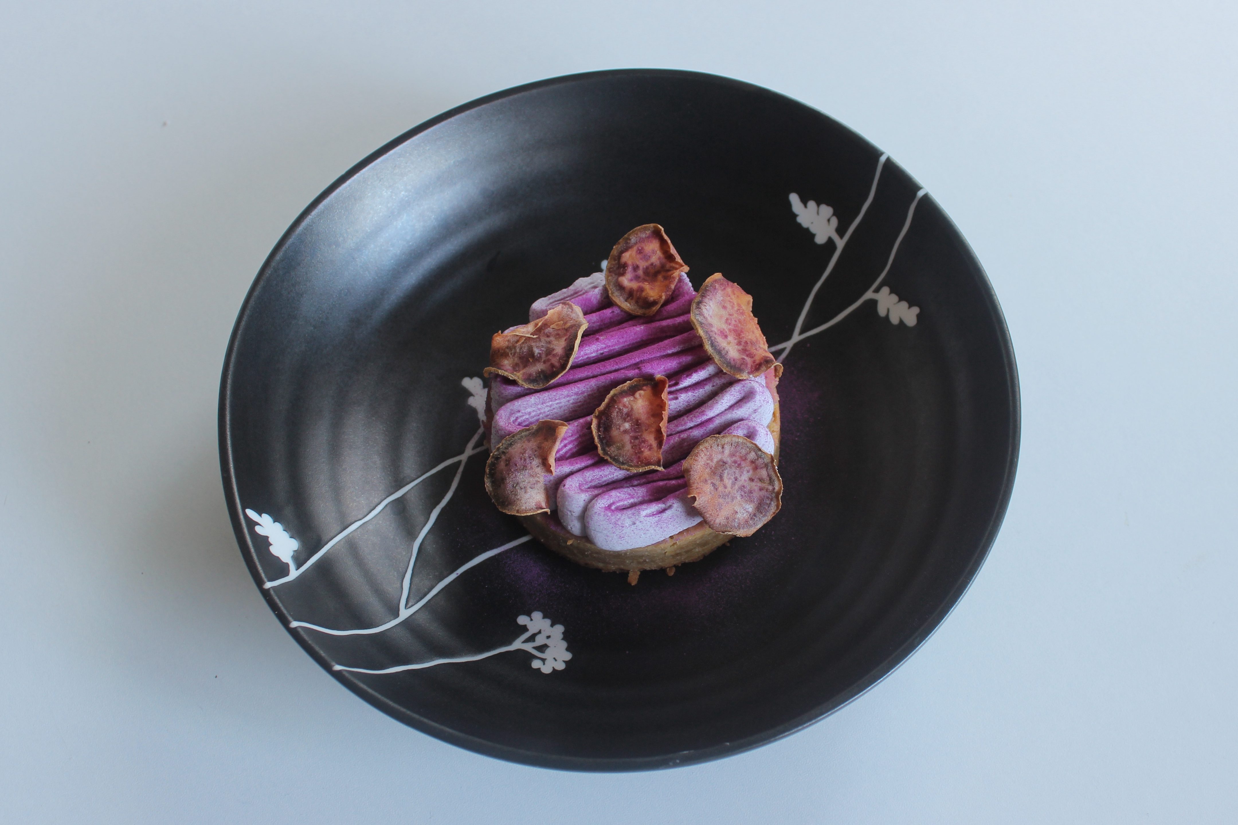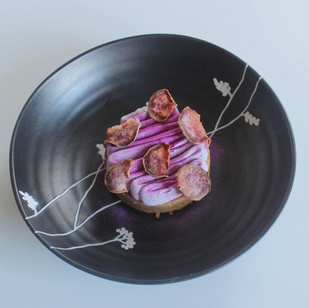 For this recipe, we have a pate sucre or sweet pastry tart shell, stuffed with a purple sweet potato custard, a purple sweet potato namelaka(white chocolate-based mousse), and purple sweet potato chips to finish. Literally the main flavoring agent here is the purple sweet potato and pretty much nothing else, which is why almost all of the components utilize a puree made from it! In terms of time and commitment there, the purple chips, while pretty, do take a 20 minutes to bake, so keep that in mind as you are getting the other garnishes ready. The pate sucre itself does need to be chilled before rolling and baking, while the namelaka needs a whopping 1 hour of setting time before you whip it to ensure it has set firm enough to retain a pipe-able consistency. In terms of where this recipe could go wrong or be challenging, it would be the namelaka and the custard. The namelaka can be overwhipped, and it is really hard to fix it if it starts to split. I found that sometimes whisking hot water into the mixture does re-emulsify it, but it is not a consistent solution. Fortunately, with the purple yam puree, since there is a lot of starch there, it actually helps with emulsifying with the fat from the white chocolate, butter, and cream in the namelaka to ensure a smooth, creamy end product. For the custard, if you overheat it, you will have sweet scrambled eggs. Which is why for my recipe, we add the purple puree after the custard is thickened so that if something goes wrong there, you don’t have to make more puree. All in all, this recipe is a bit component-heavy, but each component works in adding a different texture, and really celebrates purple sweet potatoes in so many different iterations!