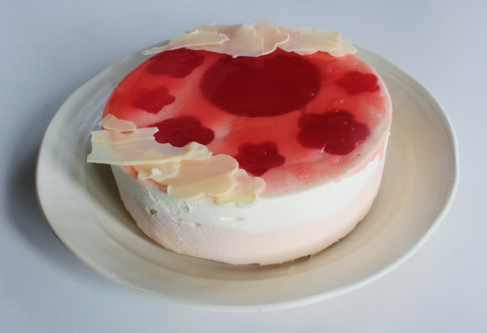 Melt down the remaining gelee with water and pour it over the still-frozen cake to form a glaze layer on top of the cake. With the chocolate, melt 3/4 of it in a double boiler, then add in the rest, stirring until it is fully melted. Spread the chocolate on an acetate sheet and allow it to firm up for 2-3 minutes before cutting out little blossom shapes. Transfer the chocolate to the refrigerator so that it can firm up further before peeling the chocolate pieces off of the acetate to use as garnishes on top of the cake to finish.