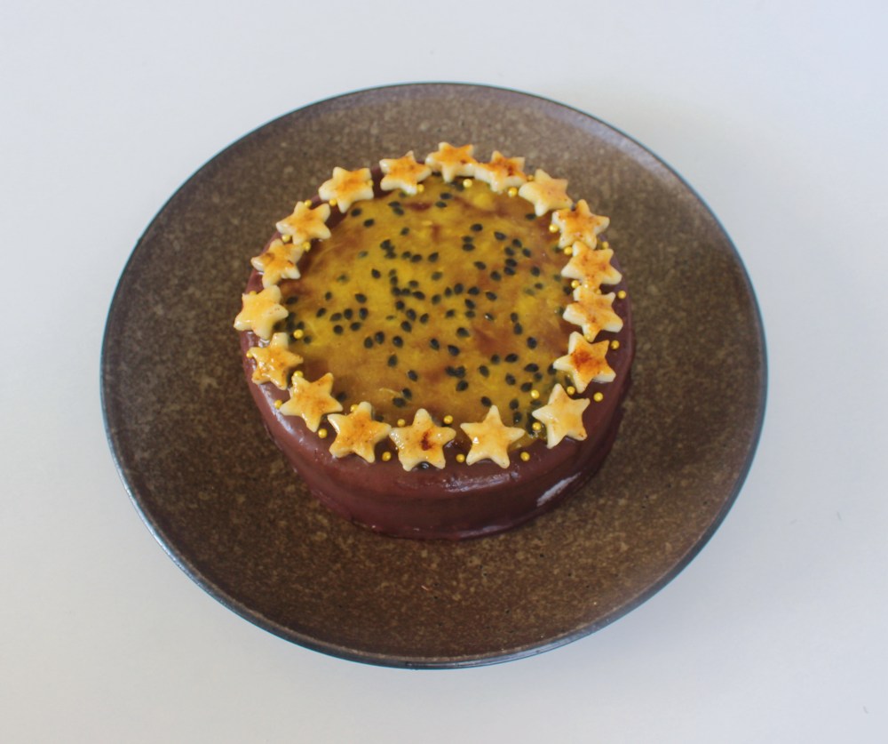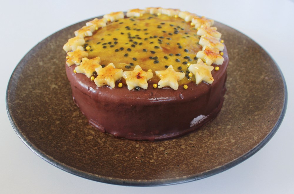 Spread the passionfruit jam on top of the cake. With the bananas, slice them into 1/4-inch thick disks and cut out stars from each disk. Sprinkle sugar on top of each banana slice and brulee the sugar using a blowtorch. Garnish the top of the cake with the bruleed bananas and the gold pearl sprinkles to finish.