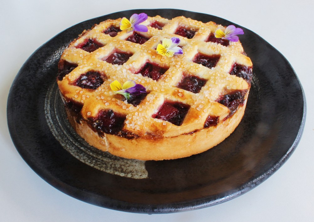 In a food processor, blend the flour, butter, salt, vanilla, and 1 egg yolk together into a dough. Refrigerate the dough for 10 minutes. Then roll out the dough to 1/16-inch thickness, then cut out a 6-inch disk. Using a 1/4-inch square cookie cutter, cut out the lattice pattern from the disk. Keep the lattice disk chilled. With the remaining bits of dough, re-roll out the dough to fill a 6-inch disk. Bake the bottom 6-inch disk at 375 degrees F for 20 minutes. Then spread the jam on top of the dough, and the lattice on top of that. Brush beaten egg yolk on top of the lattice and sprinkle coarse sugar over that. Bake at 375 degrees F for 25 minutes. Allow the pie top to cool before garnishing with the viola flowers.