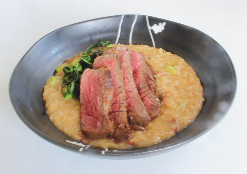 This recipe is my East Meets West take on steak and risotto. I wanted to make a risotto with steak and kale, which is something we might eat for dinner for a special occasion, but using some Japanese ingredients to give it a new identity and keep things new and different. So with the steak, risotto, and kale, I wanted to add something to each of those components. With the steak, I marinated the sirloins in koji(a Japanese bacteria that is usually used to ferment things, but adds umami to everything it is added to), cooking sake, and red miso, just to give them a stronger flavor and a more tender texture. With the risotto, one of my favorite rice dishes is grilled miso rice balls. So why not try making a risotto version of that miso rice? And just to add some color there, I added edamame in the miso risotto as a nod to edamame, being soy beans, being the basis for miso paste. That and it is a play on peas sometimes being added to risotto. What’s also funny about using miso in this recipe is that it also ties in with the usage of koji in the marinade – koji and soy beans are mixed together to form miso paste! The kale, I roasted it with furikake, which is a mixture of dried seaweed and sesame, to give it pops of texture and salt; I am obsessed with furikake kale, and it just made sense as another component to compliment the richness of the steak!