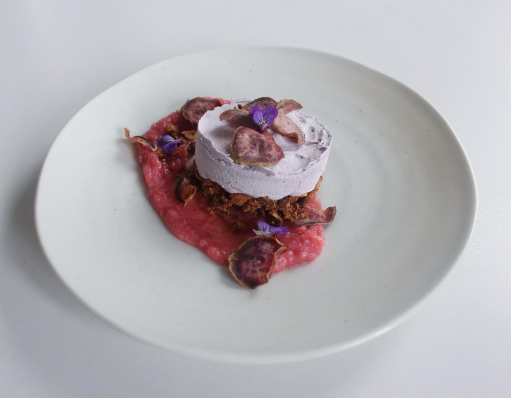 Smear the curd on the bottom of the plate, then place on top of that the crusted namelaka. Garnish the place with purple yam chips and violas to finish.