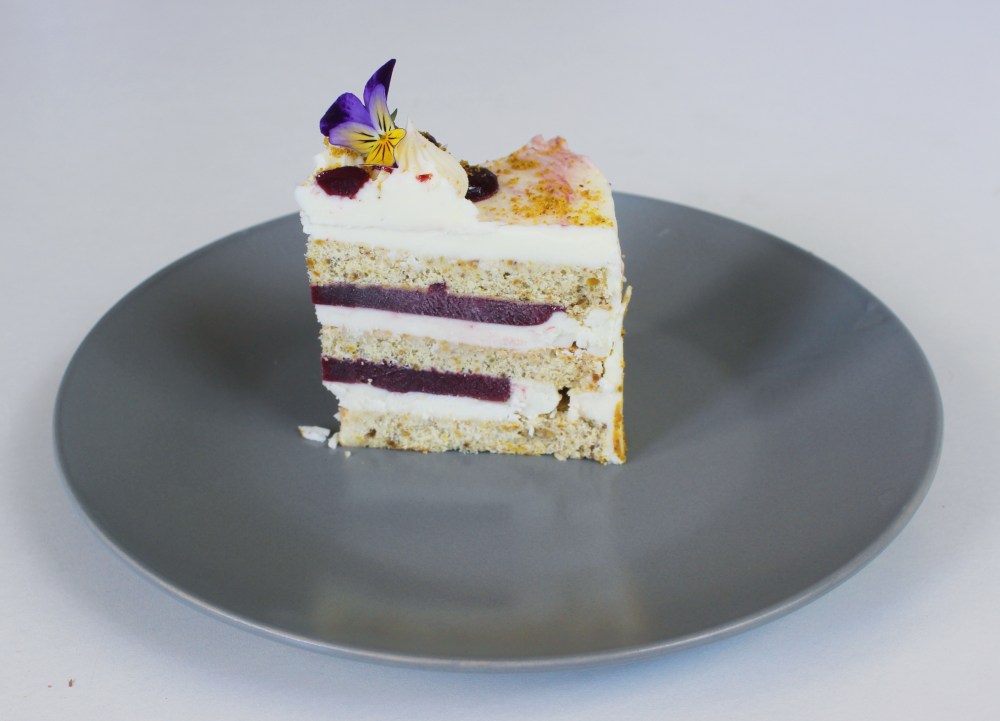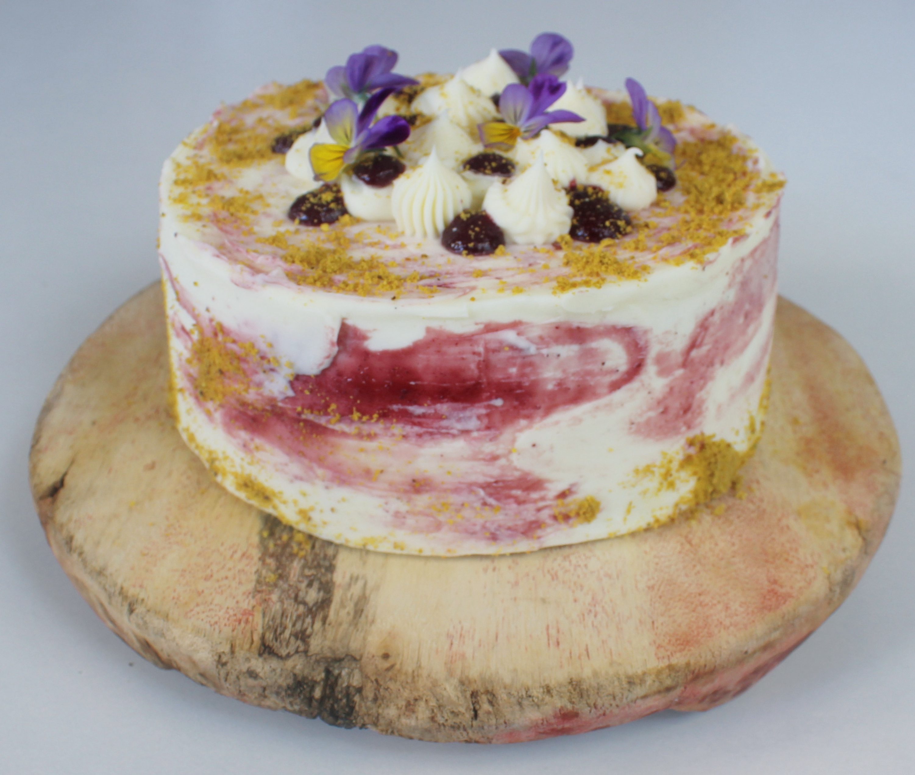 Start by placing down one of the three rounds of cake. Drizzle over that 1/3 of your soak, then spread onto that 2oz of the namelaka in an even layer. Then spread onto that 3 tbsp of the curd. Then repeat these steps for the next round of the cake, soak, namelaka, and curd. Then place on the third round of cake and apply to that the remainder of your soak. With roughly 1/2 of your remaining namelaka, spread that around the cake to form your crumb coat. Then using an offset spatula, spread the namelaka with some of the blackberry curd drizzled on it around the cake to form your final coating. With any leftover namelaka or curd, transfer both to separate piping bags and pipe on top of the cake. Freeze the cake solid before transferring to a desired serving platter. Sprinkle pistachio powder around the cake and garnish the top with violas to finish.