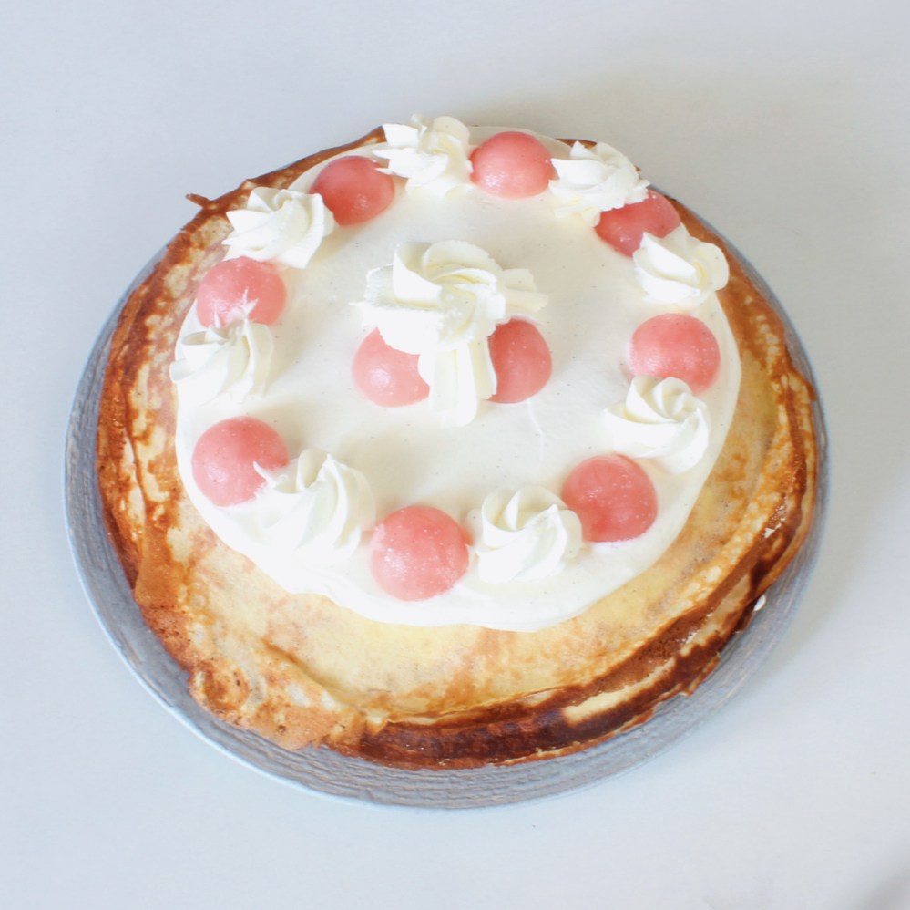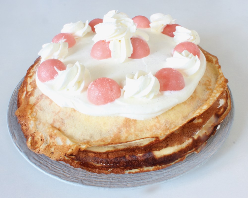 Start by smearing 2 tbsp of the cream onto a crepe. Then layer on 6-8 slices of the pink peach. Repeat these steps over and over again, until you are on the last layer. Start with the last crepe, then spread a layer of cream. Then arrange the pink gelee and pipings of the cream on top to finish.