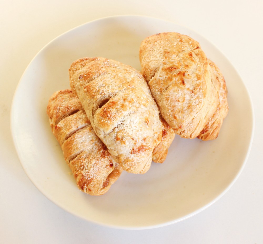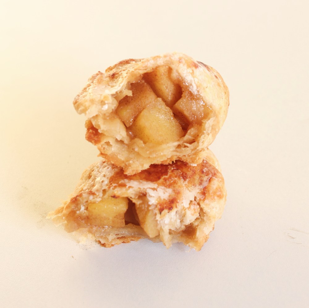 Roll out the puff pastry to be roughly 1/16-inch thickness. Cut out 4.5-inch disks of dough, re-rolling and cutting the dough as necessary – I was able to get 10 disks out of this recipe! Brush the edges of the dough with beaten egg. Place about 3 to 4 tbsp of the apple filling into the center of each dough disk before folding the dough in half, crimping the edges together. Brush more beaten egg onto the surface of the pies. Using a paring knife, scallop the edges of the pie, and score the rounded sides of the pie two to three times. Repeat these steps with the other pies. Place each pie onto a lined sheet tray, spacing them 3 inches apart. Bake at 375 degrees F for 20 minutes. Then dust powdered sugar on top of each pie, and return to the oven, baking them now at 400 degrees F for another 10 minutes.