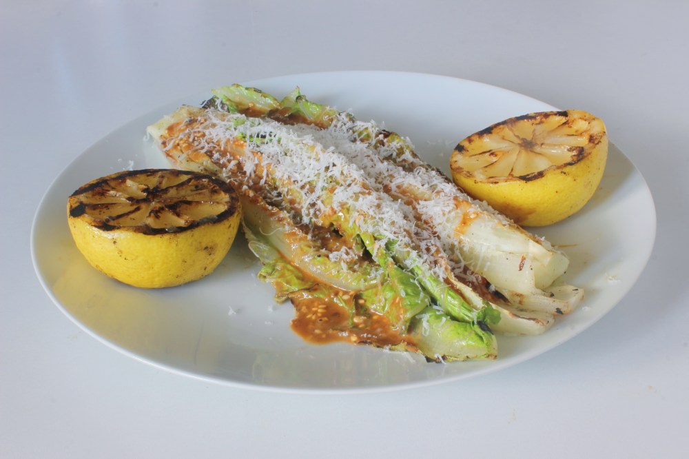 Cut the Romaine lettuce in half, lengthwise, Brush both sides of the lettuce with brown butter and salt. Grill the lettuce on high heat for 2 minutes on each side.