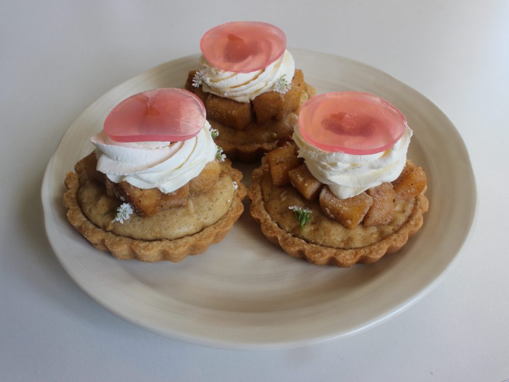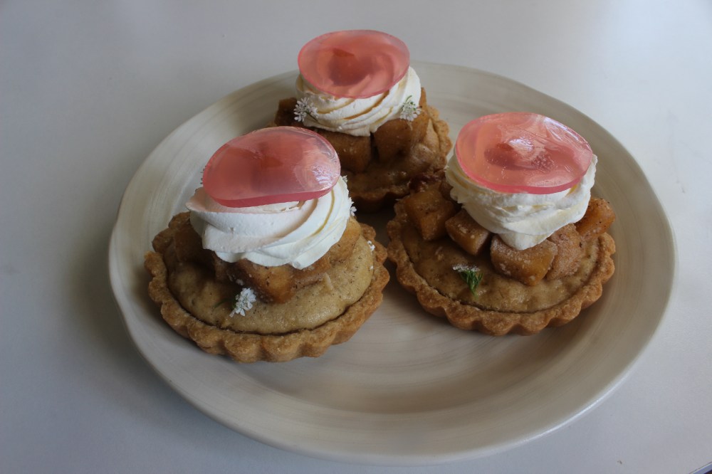 From a component standpoint, there are some really technical parts of this recipe. The coriander mascarpone is the biggest time suck, because you need to give your heated cream ample time to firm up in the fridge after stirring it with the lemon juice on low heat to curdle it. I would recommend getting that out of the way first, so that as you work on the other components, the cheese will have time to solidify. For the other components, we have a brown sugar pate sucre(sweet pastry), which is our tart shell. The tricky thing here is that we need to bake the tart shell first, then fill them with a brown butter-Aomori apple cake batter, then bake them again. If the shells weren’t baked off enough prior to adding the filling, there will be this layer of raw dough/batter in the bottom of the tart shell that will never fully bake. The apple confit is basically a chunkier version of an apple jam, making it a fairly easier component to make. The apple peel gelee is a fun one, because you’re making a syrup with the apple peels first, just to extract that pink color, then you are melting agar into that and setting it into disks to garnish the tops of the tartlets with. All in all, I would still rate this recipe a 7/10 in terms of difficulty, because the mascarpone can be unforgiving(you can accidentally scramble it if you heat it too high or for too long), and the tart and cake situation can’t be rectified if one portion of it is raw. That being said, if you like apple desserts, this is still one to definitely try out! Even without the Aomori apples, try it with Fuji or gala apples for a similar result!
