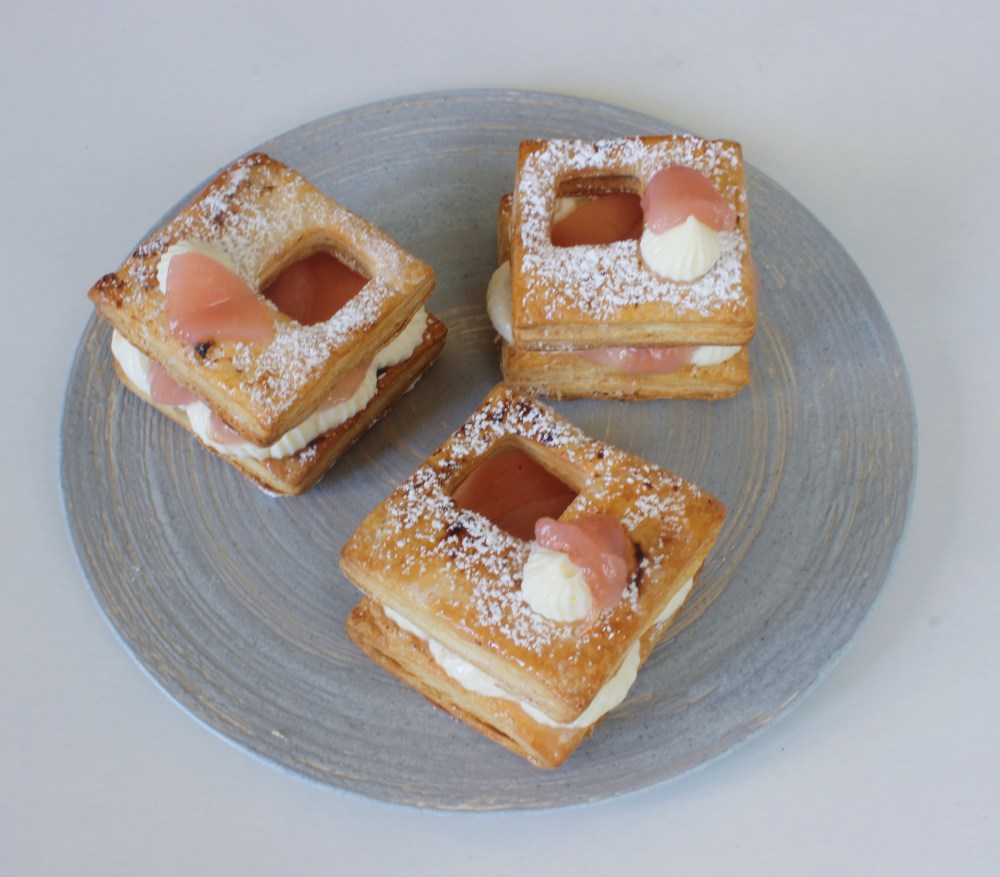 I just had to make some fun pink peach desserts whenever white peach season rolls around. It’s so fun to take the peach peels, turn those into a simple syrup, and then simmering white peaches in those until they take on the pink color from the syrup itself. They are such a pretty garnish, and one that I wanted to feature in the form of a mille feuille! A mille feuille, French for “thousand leaves” or “layers”, is a French pastry that consists of layers of baked puff pastry and usually a sweet cream. Fruit, typically berries, is also used as a garnish throughout the layers, just to add color and freshness. In this case, I went with the pink peach as my fruit of choice, just to add a pleasant color. Whenever Pinktober rolls around, I always want to bring my Pink dessert game whichever way I can, in honor of my mom being a breast cancer survivor. I also strongly associate white peaches with my mom, because she would pick them for us from our backyard during the summer, when white peaches are usually in season!