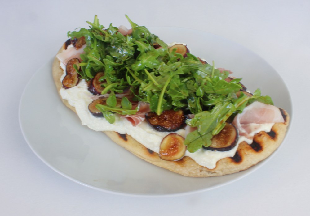 Toss the arugula with olive oil and salt. Spread the mascarpone-feta mixture on top of the flatbread, and garnish with the grilled figs, torn pieces of prosciutto, and the arugula on top to finish.