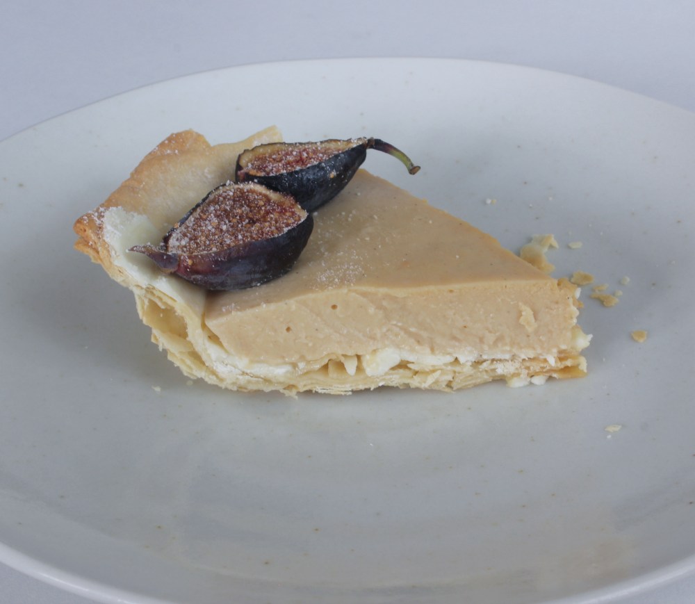 This phyllo pie is a revisitation of the apricot-almond tofu pie I made a year ago, but this time, featuring figs and burnt honey! I love baking tarts with my homemade phyllo, just because it gets really crispy and flaky as it bakes. In the case of this recipe, I did make some substitutions. Instead of brown butter, I used olive oil to play off of the figs. With the filling, I still did an almond tofu filling, since I love pairing almonds and figs, but I subbed out the sugar with burnt honey. I love the complexity of caramelized honey, and it adds a much needed contrast to the much milder figs, compared to the tart apricots. Figs, honey, almonds, and olive oil come together to make a delicious combination, with sweet, nutty, grassy, and bitter all being flavors represented across those ingredients! I also adorned the edges of my pie with an olive oil-white chocolate powder, just to bring in more of that mild olive oil flavor, while also adding some color contrast – while I love the aesthetic of powdered sugar on desserts, it gets too sweet for my taste, but this white chocolate-olive oil powder, due to being made with maltrodextrin, which kind of mutes the flavor of other ingredients, is not too cloying by comparison! All in all, this was a pleasant, summer to autumn take on my previous apricot phyllo pie!