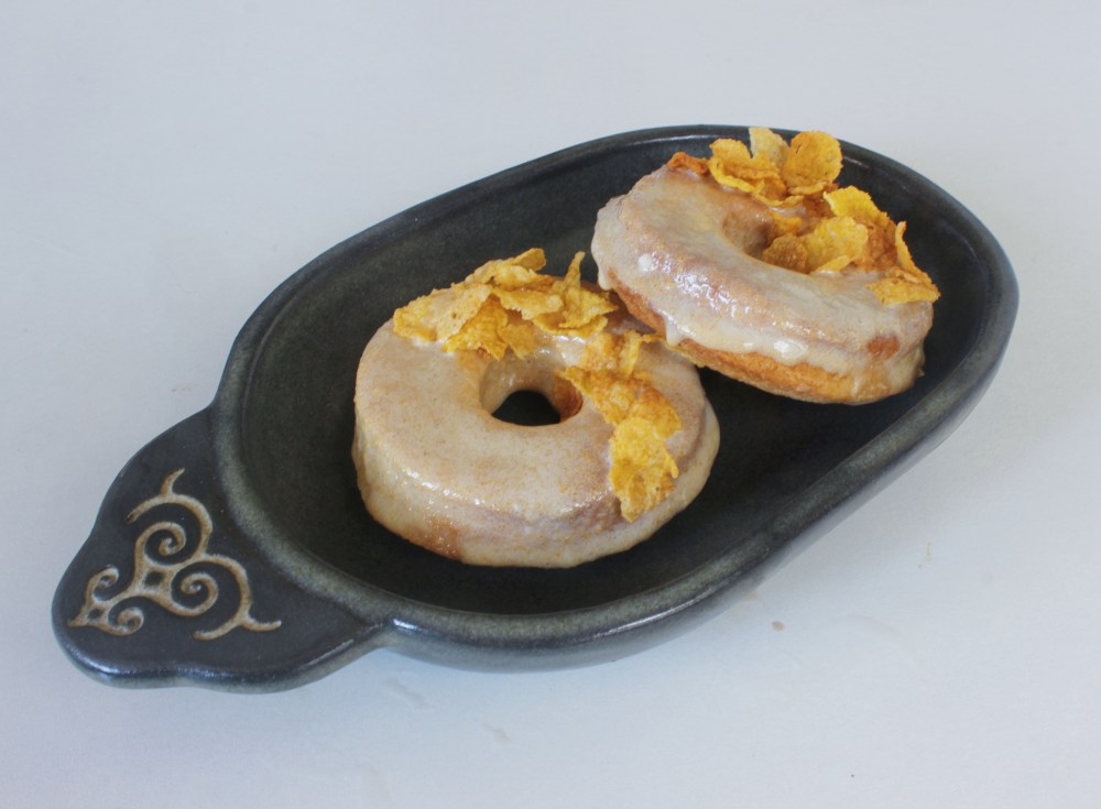 In a bowl, whisk everything together until a smooth glaze forms. Dunk each doughnut into the glaze, then place them on an icing rack, allowing any excess glaze to drip off and set. Sprinkle the cornflake garnish on top to finish.