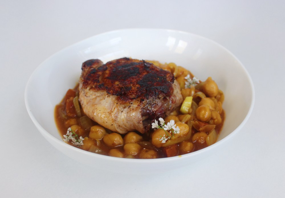 This dish is the perfect thing to eat on a cold, rainy dish. I made these chorizo-stewed chickpeas because I wanted this hearty, comforting stew. What I love from a textural contrast standpoint is that there are smoky chorizo bits and nutty, creamy chickpeas, swimming in a slightly spicy broth. That when paired with a juicy roasted chicken thigh with crispy skin, and you honestly have a real winner there! What I love about this recipe is the play on chicken and chorizo for two different proteins. Technically there’s three since chickpeas count as a source of protein, being a legume and all, but it also acts like a starch in this case, soaking up the chorizo stew that we’re making here. For the chicken, we basically cook it low and slow, in the pan the entire time, just to really render out the chicken fat – that’s being used to sweat out and toast spices in the stew itself, just to reuse the product, since chicken fat is DELICIOUS. While the chicken is rendering, we can work on the stew, by cooking off all of those aromatics in a mixture of chicken and chorizo fat, and imparting all of that flavor into the chickpeas. This is a really hearty dish, and one that can make a day with miserable weather slightly less sad.