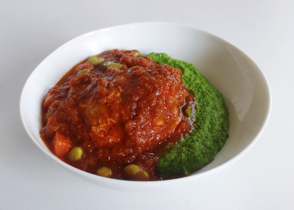 This dish was really meant to be a homey meal, hence why it kind of looks like a giant pile of slop in a bowl. Those kinds of dishes are indicative of the fall/winter, being super cozy, comforting dishes that are ugly-delicious. In this case, I wanted to do chicken cacciatorre, an Italian dish consisting of chicken that is stewed in a rich tomato sauce. I like to make my cacciatorre with kimchi, just to add another layer of umami to the braised chicken and a mild spice. And to add a bit more spice, I also used calabrian chilies for that pleasant kick. In terms of what I served my chicken kimchi cacciatorre with, I went with an herby, cheesy polenta. I used kale, basil, and parsley to make this vivid green cream, and then finished a parmesan polenta with that to give it a bright Incredible Hulk color. It was meant to play off the cheese, since basil and parmesan cheese are a wonderful combination, and when you combine those with basil, you have a pretty solid trio of Italian ingredients that bring a lot of umami to the table here. I will be honest in that this recipe is a pretty easy one, since the main star, the cacciatorre, is a one pot wonder that relies on building layers of flavor by cooking things in the pan, then adding more things to whatever was cooked in there before(i.e. starting by rendering out the chicken thighs, sweating aromatics out in that, turning that all into a sauce, then braising the thighs in said sauce to really get a lot of flavor in there). The polenta, expect to be whisking a lot, but so long as you whisk the polenta while it’s on the stove, it won’t burn on the bottom and you will have a creamy, soft polenta, perfect for soaking up all of that lovely cacciatorre sauce with!