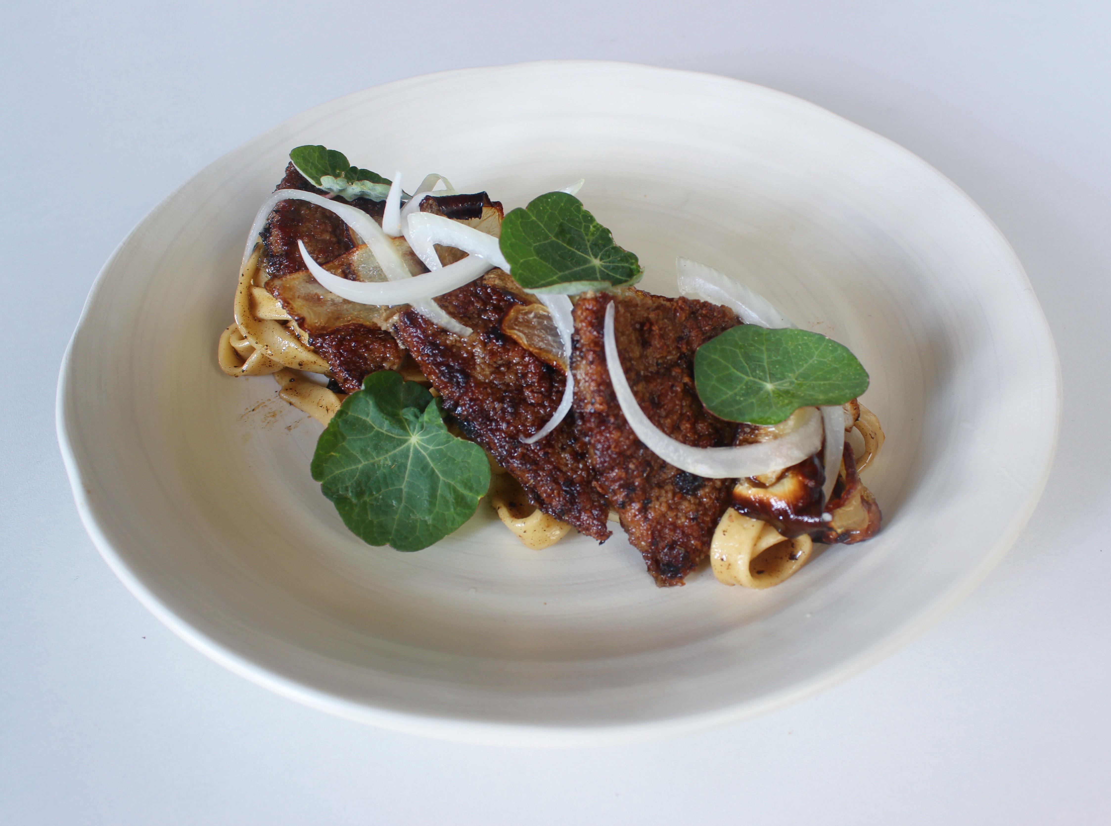 A while back, I made a liver and onions picatta dish, and it got me craving more calves liver. Which is hilarious because I love calves liver already. When I made that picatta dish, I went with lighter flavors, using a lot of acid, capers, and caramelized onions for a more dainty feel/contrast. So I figured, why not do a take 2 on that liver and onion dish, but with pasta instead of noodles, and a richer bacon-based sauce? With the weather finally getting colder, I wanted to make a dish that is more comforting and filling. I remember when I did research on classic liver pairings, bacon came up as an option. And that works for me, because bacon makes everything better. Liver, especially how we’re cooking it in this recipe, is meaty, but creamy. Bacon adds that saltiness and smokiness that makes liver taste even less like offal, which is a win for everyone, even if they liked liver to begin with. So I wound up making a bacon-brown butter sauce to toss my homemade pasta noodles in, and served that with a combination of roasted onions, pickled onions, and the calves liver pieces. I revamped the proportions of each component too, serving smaller pieces of the liver, almost like large pieces of bacon or prosciutto, layered with the roasted onion petals, and layered some pickled onion slivers and nasturtiums on top for color, a little height, and brightness. The onions in this case add sweetness, toastiness, and acidity, to help balance the richness and iron-y taste of the liver. It almost is like having a separate liver and onion dish with a pasta dish underneath it, but all of the components do come together to make a dish perfect for a cold day when you want a comforting bowl/plateful of noodles.