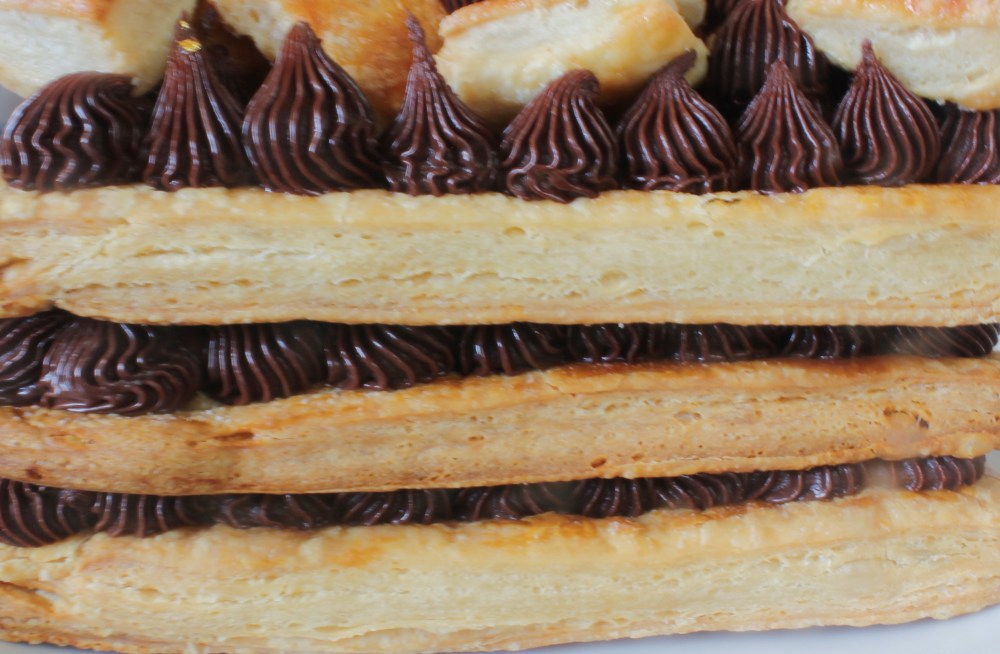 In a pot, heat up your milk, chocolate, Nutella, salt, butter, and tonka. Once everything is fully melted together, take the mixture off heat and stir in the heavy cream. Allow the ganache to cool in the refrigerator for 20 minutes before whipping until soft and spreadable. Transfer to a piping bag. Pipe the ganache onto the cooled down puff pastry rectangles and stack them to form your mille feuille.