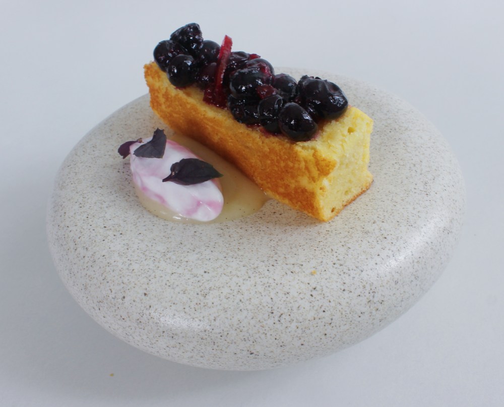 Start with a dot of the yuzu curd in the center of the bowl. Place down the castella and spoon the macerated blueberries on top. Off to the side, do a quenelle of the yogurt, and garnish the top of that with the purple basil leaves.