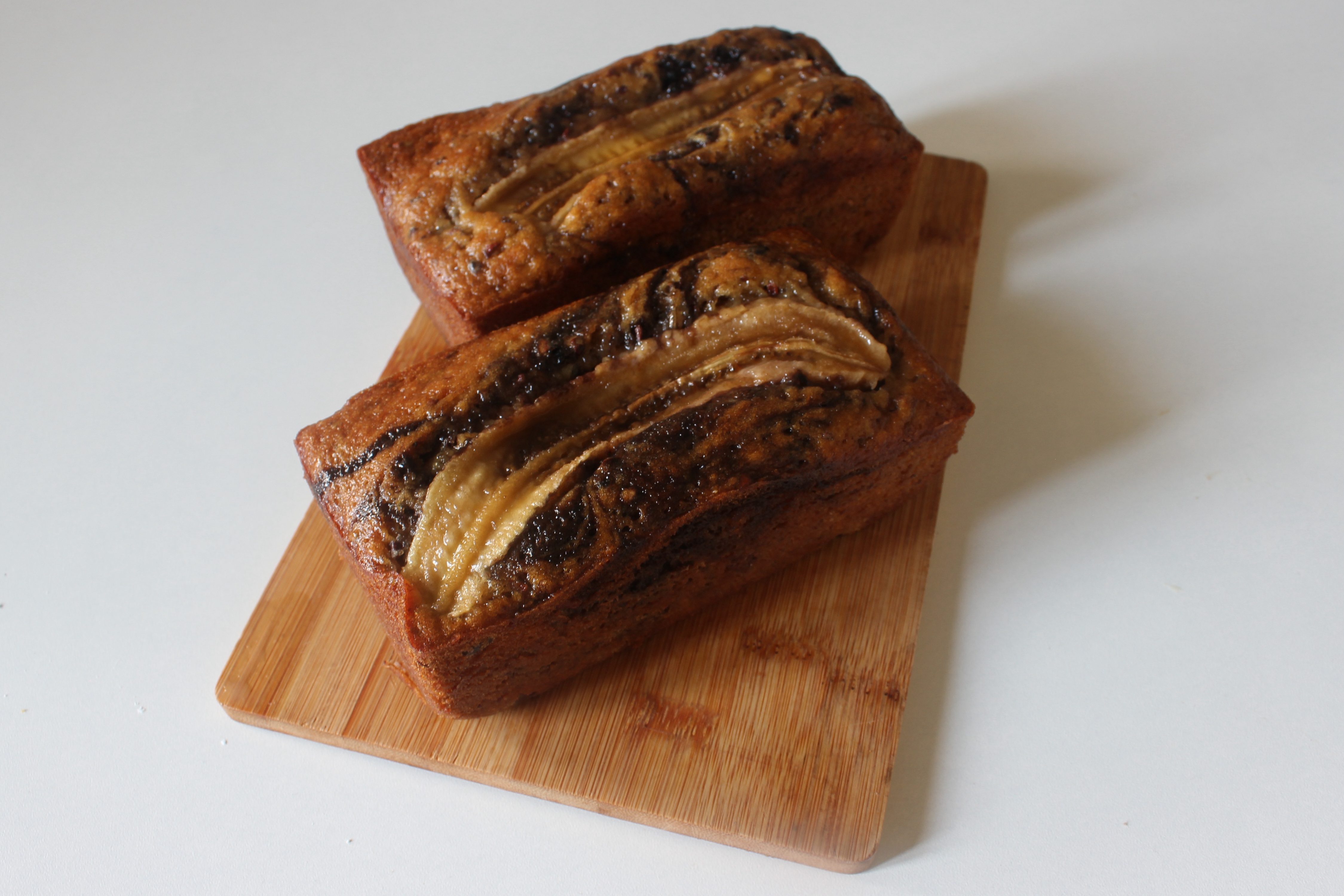 To the non-chocolate batter, fold in the cacao nibs and Azealia chocolate. With the chocolate batter, fold in the blonde chocolate. Fill four 3-inch by 5-inch loaf pans 2/3 the way full with the batters, swirling them. Spoon 1oz of Nutella into each loaf and press in the halved bananas, flat side up, into each loaf. Bake at 350 degrees F for 40 minutes. Allow the loaves to fully cool before attempting to unmold.