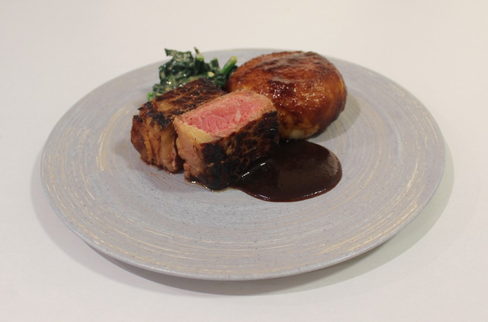 Meat and potatoes is a classic that I’ve done spins on before on this blog, and I figured, New Year, new take on meat and potatoes? In this case, I wanted to do another steak, but for the potato portion, I wanted to combine experienced from my recent trips to Germany and Japan, paying homage to German potato dumplings, and make potato mochi. Probably popularized from Pokemon Legends: Arceus, potato mochi is made by mashing potatoes with potato starch into a soft, malleable dough, then searing it on both sides, and finishing it in a sweet-salty glaze, similar to dango glaze. It is extremely similar to a German potato dumpling, so I figured using it as a starch in a plated dish would be a fun way to go. I also brushed mine with kewpie mayonnaise, just to get a nicer sear and browning on the surface of the mochi, while adding an additional layer of umami on it. With the steak, I did a simple salt and pepper sear, but basted it in a mushroom soy-garlic butter, just to give it some nuttier notes while amplifying the savoriness of the meat. To add some freshness, I blanched and shocked some kale to give it a vibrant green color, and dressed it with shiraae, which is a Japanese sesame-tofu dressing, adding some creaminess, and more nuttiness to play off of the steak, in addition to a simple pan sauce to tie everything together. This dish is fairly simple in composition, but it gets the job done in terms of taking steak and potatoes and doing a slightly different take on them!