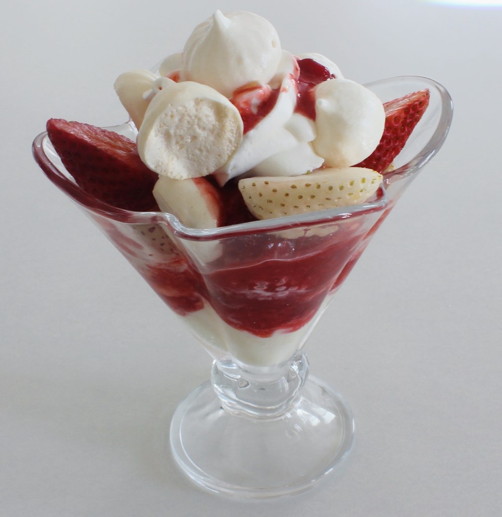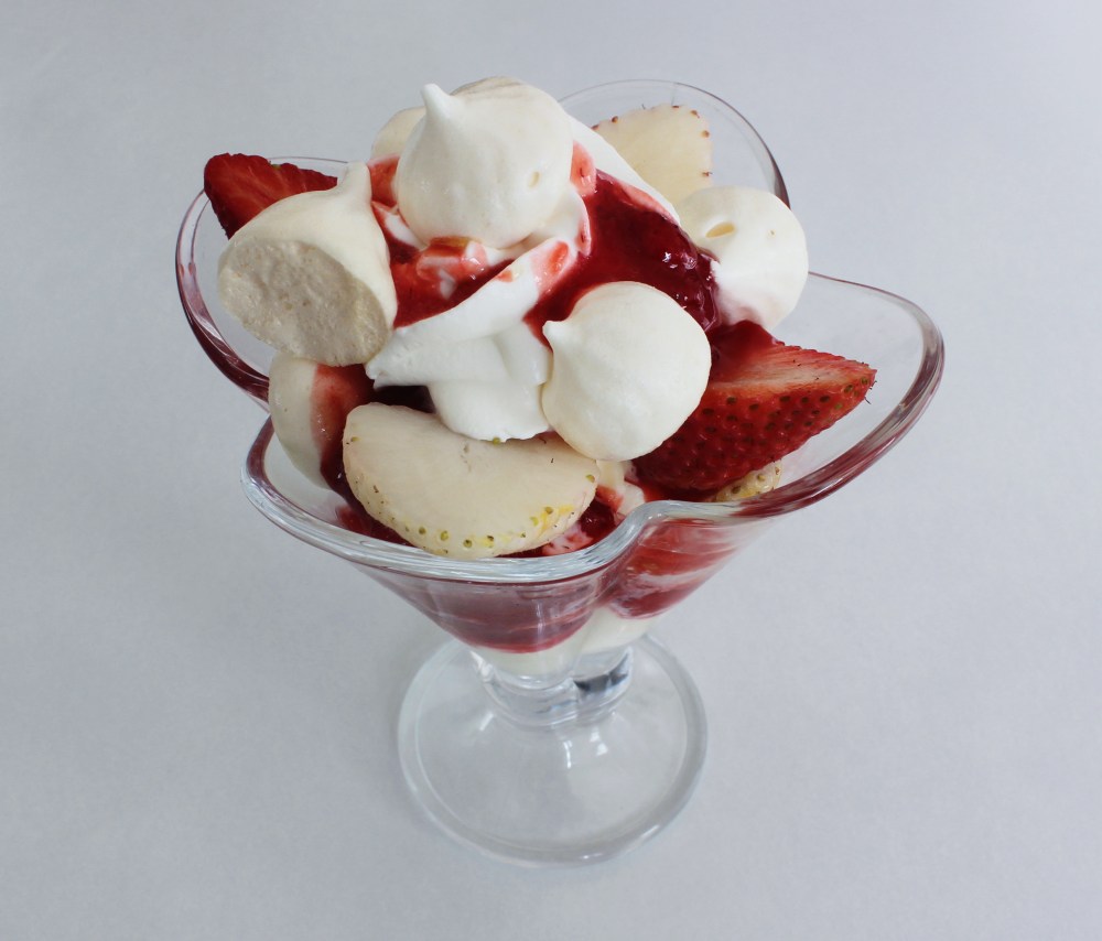 For the components, we have a goat milk-tonka bean gelato, tonka bean whip, tonka bean meringue kisses, roasted strawberry jam, and fresh strawberries/pineberries. Before anyone raises a red flag at the large amount of tonka bean components(apparently if you eat 30 tonka beans, that’s not good for your health), we are not even using an entire gram of grated tonka bean across the entire dessert, and that’s for 2 servings. So no, this sundae won’t kill you(unless you are lactose intolerant, in which case is might semi-kill you, since even though goat’s milk lacks lactose(say that several times in a row), the ice cream does contain heavy cream and is garnished with whipped cream. The ice cream tastes almost like coconut, with this nutty, rich flavor to it, while the goat milk tempers the sweetness so it’s not too cloying. The roasted jam tastes like a better version of a strawberry preserve, because by cooking down the red fruit in sugar, the flavors really intensify so you’re left with a tender strawberry jam that is reminiscent of the strawberry sauce you’d find at an ice cream bar, but honestly better. You can actually taste the fruit in this jam instead of the sugar. I also added the meringue kisses for crunch, since otherwise you have mostly soft textures throughout the other components(whip, ice cream, jam, and fresh berries). There is definitely some time needed to prepare this recipe in advanced(ice cream and roasted jam need to chill down and meringue kisses need hours to dehydrate in the oven), but it was a lot of fun to make, and that ice cream alone is worth making, especially for a sundae or even a plated dessert in the future!