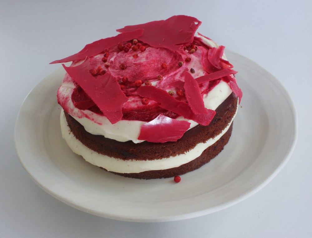 To assemble the cake, start with one round of the red velvet and spread on half of the cream cheese ganache. Swirl into that half of the coulis. Repeat these steps for the second layer, and garnish with pink peppercorns and shards of the Raspberry Inspiration to finish.