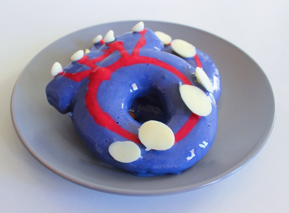 With this week leading up to the always much-anticipated Pokemon Day, I figured I would celebrate the week(in hopes that Generation 10 is right around the corner), by making three Pokemon-themed doughnuts, inspired by the most recent game, Pokemon Legends: Z-A, specifically from the DLC, Mega Dimensions! Now, I’ve been obsessed with the Legends Z-A for quite a bit(even though admittedly, the real time game mechanics are very stressful since I prefer my usual turn-based Pokemon games where I can get a second to access and strategize), but one of my favorite parts, besides exploring the criminally under-utilized Kalos region(specifically just Lumiose City since that’s where the game is limited to, even though lets be real, we all just want Southern Kalos to be a thing), were the new doughnuts introduced in the DLC. These doughnuts, somehow created by a 5-year old named Ansha, can give you special powers, like finding rarer items, shiny Pokemon, and even in some cases, Legendary or Mythical Pokemon. Three doughnuts she made in particular harken back to Generation 3’s weather trio, Kyogre, Groudon, and Rayquaza, and those three doughnuts are the ones I will be making and posting recipes for! In the games themselves, they are all referred to as old fashioned doughnuts, which means that they are craggy cake doughnuts. The difference between a cake and a raised doughnut is that a cake doughnut uses baking powder to leaven it, creating a denser, crumblier doughnut, while a raised doughnut uses yeast, resulting in a softer, pillowier doughnut. While I usually prefer raised doughnuts to cake, they both have their appeals! In the case of this recipe, we are going with Kyogre. Introduced as the mascot of Generation 3’s Pokemon Sapphire(which was the first English Pokemon game I ever played), Kyogre is this blue and red orca-looking creature that raised the sea with storms and rain. I switch between viewing it as terrifying or derpy, depending on the angle you look at it, but either way, a fun visual design to capture in a doughnut.