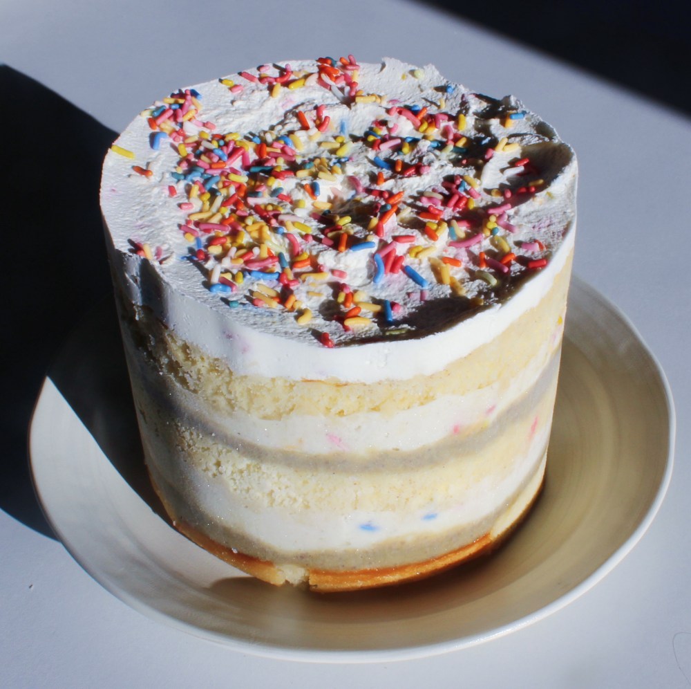 Line a 6-inch ring mold with acetate and place onto a transferrable sheet tray. Start by placing down one of the cake rounds, and applying 1/3 of your syrup. Then spread 1/3 of the pistachio butter, then 1/3 of the cream, adding in generous amounts of sprinkles and swirling those in. Repeat for the next two layers and freeze the cake solid before attempting to unmold.