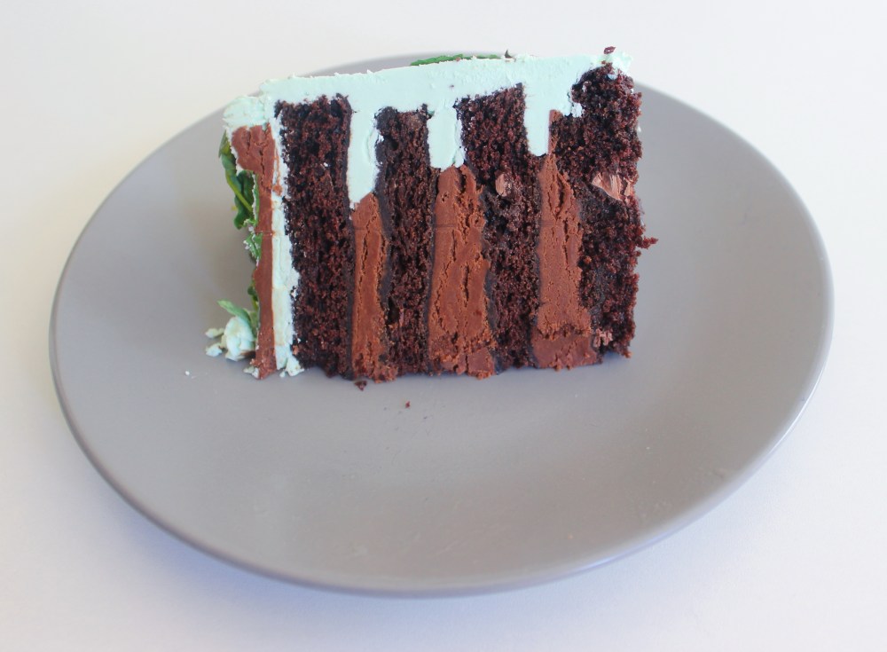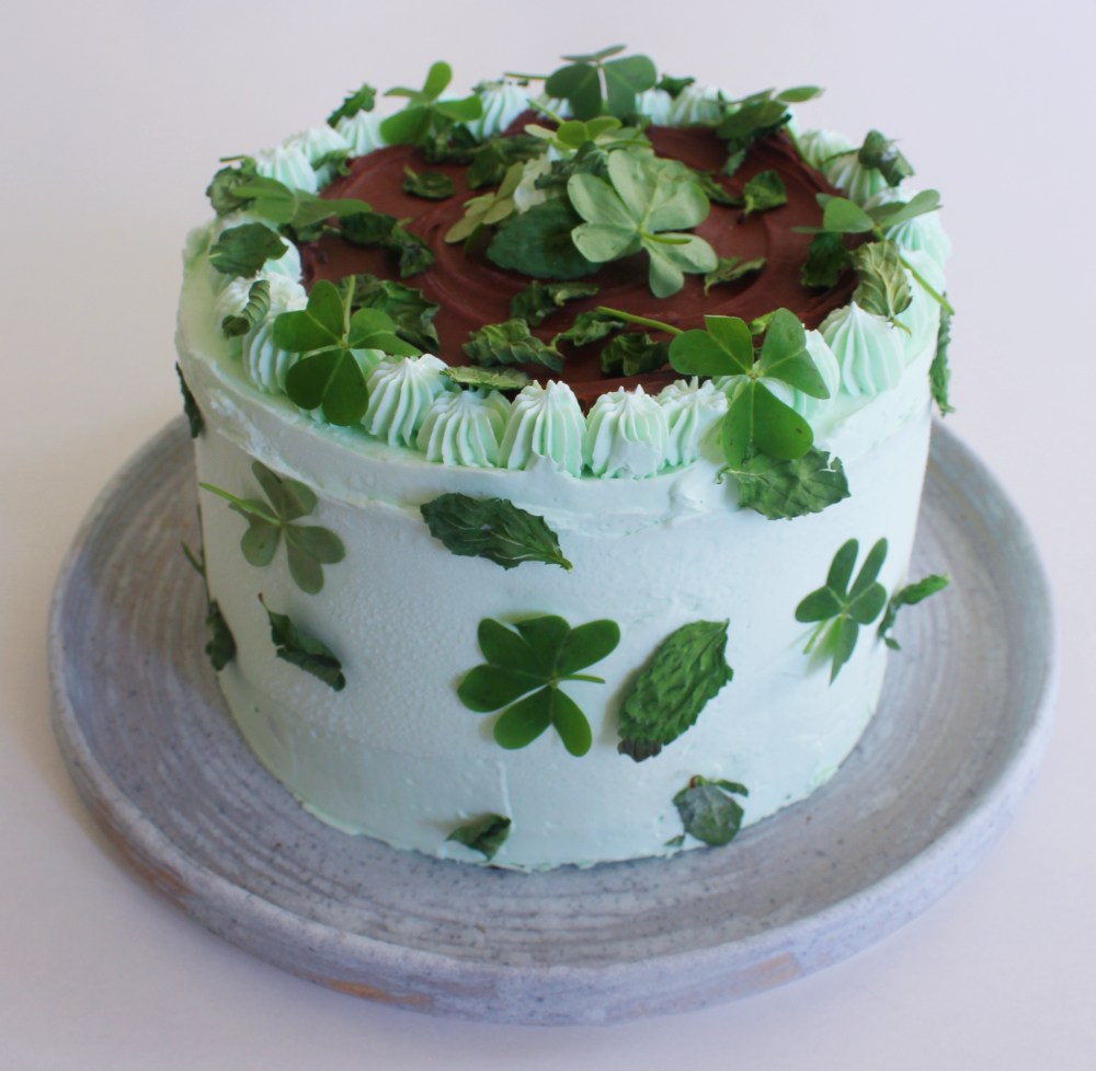 A long, long time ago, I made a grasshopper pie using creme di menthe, which is an intense mint liquor. Think alcoholic Listerine, To be honest, outside of extremely niche usages, like maybe a mint julep, I can’t see why anyone would want to drink creme di menthe, especially on its own. That being said, when cooked down, it can flavor a mint dessert gorgeously, with a distinct mint flavor. I can maybe see it also working in a mint jelly situation that you might pair with lamb(but honestly, does anyone actually eat the mint jelly served with lamb? I always found it weird, but maybe it’s a cultural thing). That whole tirade about creme di menthe to say, I’ve had some fun experimenting with this liquor. So for St. Patrick’s Day this year, I wanted to bring that creme di menthe back, and use it in a chocolate shamrock cake. Which is just my semi-festive way to say it is a chocolate mint cake. For the cake itself, as a small nod to Irish soda bread, I used soda water in the batter, just to give the chocolate cake a light, airier crumb. Fun fact: carbonated beverages make cake batters fluffier. I layered that with a soak, a mint ganache, similar to a nama chocolate, but replacing the sake with our favorite creme di menthe to impart that mint flavor. I also made an Italian meringue buttercream with the creme di menthe, which took on a gorgeous green color and a pleasant mint flavor – tempering that stuff with sugar and butter seems to be the way to go, at least in terms of making creme di menthe tolerable in a dessert, but that might just be a general rule of thumb for everything. To garnish, I microwaved mint leaves to dry them out, and also got fresh oxalis(wood sorrel, which looks like a clover and has a sour pop to them), just to add more natural greenery.