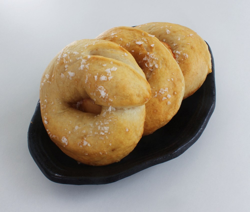 So I’ve been seeing videos of shio pan bagels, and it just sounded like a fun idea to use my sourdough starter to recreate! Shio pan, for those unfamiliar, is a Japanese pastry that literally translates to “salt bread”. They are soft, tender, croissant-looking bread rolls that are baked with butter in the middle, so they just puff up in the middle. In the case of these shio pan bagels, in the video that showed them, it looked like they took shio pan dough, stuffed them with butter, shaped them into bagels, and treated them as such – i.e. boiling them then baking them with plenty of flaky salt on top. While making these with a yeasted dough would be a lot faster and more efficient compared to sourdough, I figured the tang from sourdough would play off the rich, buttery flavor well. That and I just got back into feeding my now two-year old starter, so I figured I might as well put it to work and use it for some fun new bakes! The final bagel had a nice golden brown exterior, a soft, almost butter interior, and captured what I love in both a good bagel and a soft shio pan bun!