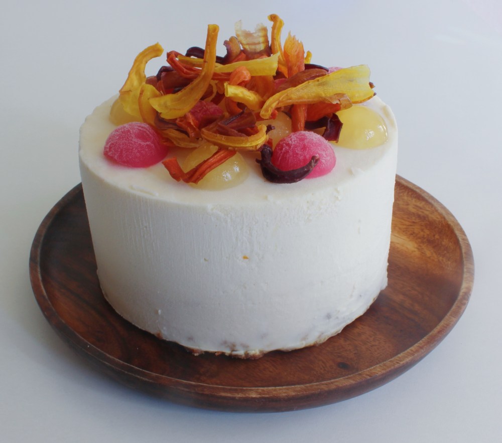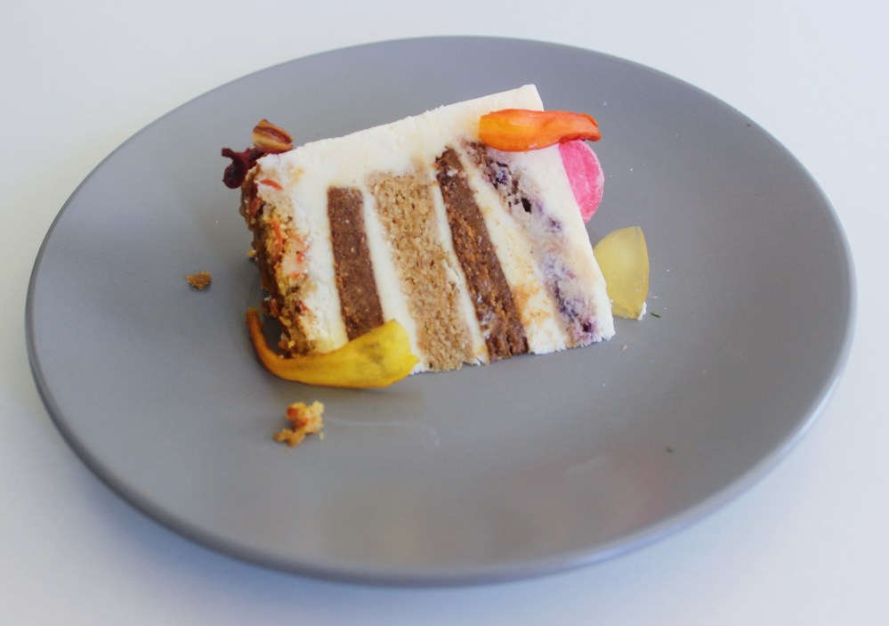 I have done a rainbow carrot cake once before, but this variation was my way to revisiting that, but in a more concise and focused way. For this version, I made three different carrot cake batters, one with an orange carrot, one with a yellow carrot, and one with a purple carrot. I also wanted to add another component to bring in more flavor, so I went with a miso-pecan praline. Making a nut praline is interesting, since you’re making a nut butter, and blending in caramel into that. It can potentially overheat and break your blender/food processor if you do not blitz it in intervals, so just something to keep in mind there. When it came to the other components, I wanted to go the goat cheese route, since that was going to add a pleasant tang to contrast the cake. I used goat cheese in a mousseline, which is a pastry cream that is whipped with butter, and in this case, cream cheese and goat cheese, just to get a lighter, spreadable consistency. And for the other components, I candied rainbow carrots in simple syrup – when I saw the gorgeous color the syrup took on, I just had to take that and make a gelee(with yuzu juice to temper the sweetness) out of it, so that the pretty colors could be captured and used to decorate the cake itself! This was a recipe that evolved over time(I actually had to redo it because my first attempt literally imploded and fell apart as I tried to layer it up because my cake layers were too thick, and I tried to layer the cake up when the mousseline was not set enough), but I am extremely happy with how the end result came out! I had envisioned this clean cake with smooth goat cheese mousseline, and when you cut into it, there are colorful layers between the three carrot cakes and the praline, as well as the gelee and carrot chips on top. If you wanted something pastel/semi bunny-themed for Easter, this might just be your recipe!