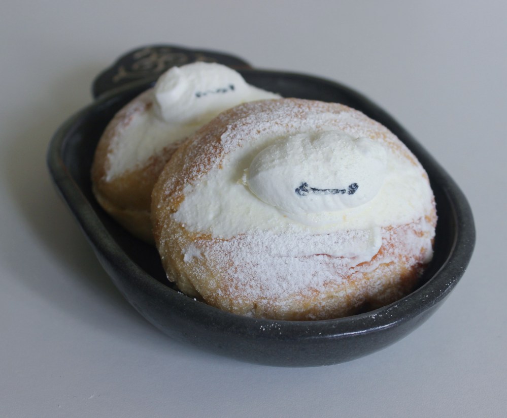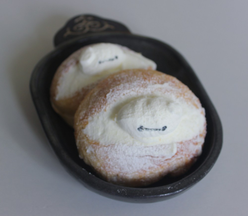 Stuff the maritozzo with generous amounts of cream, and level it off with an offset spatula. Place on top of the cream the frozen dollop and dot on the eyes with the black market. Dust the tops with confectioner’s sugar to finish.